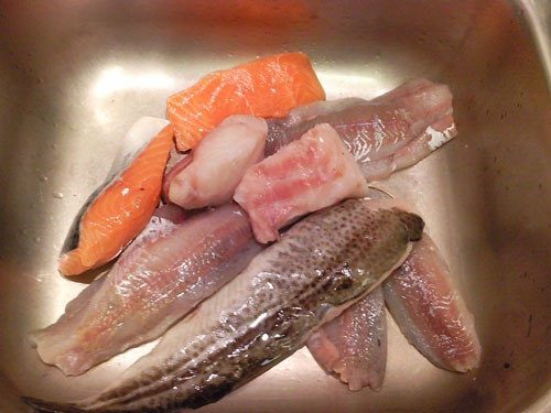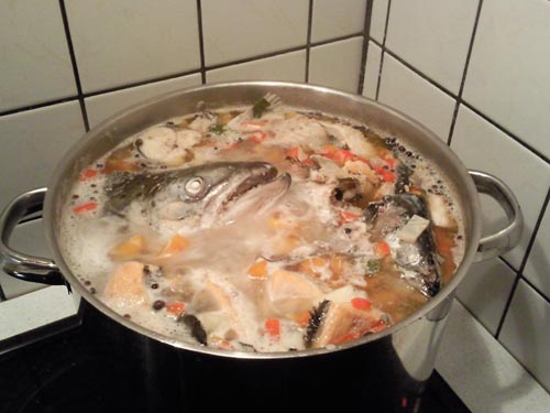 Diese Fischteile (ca. 2-3 kg) kommen in einen großen Topf (10