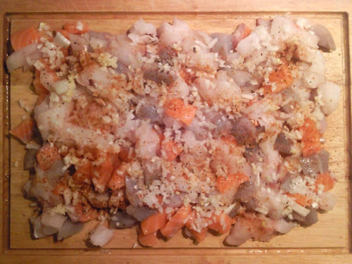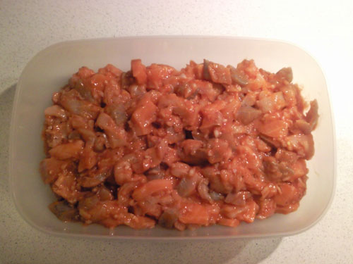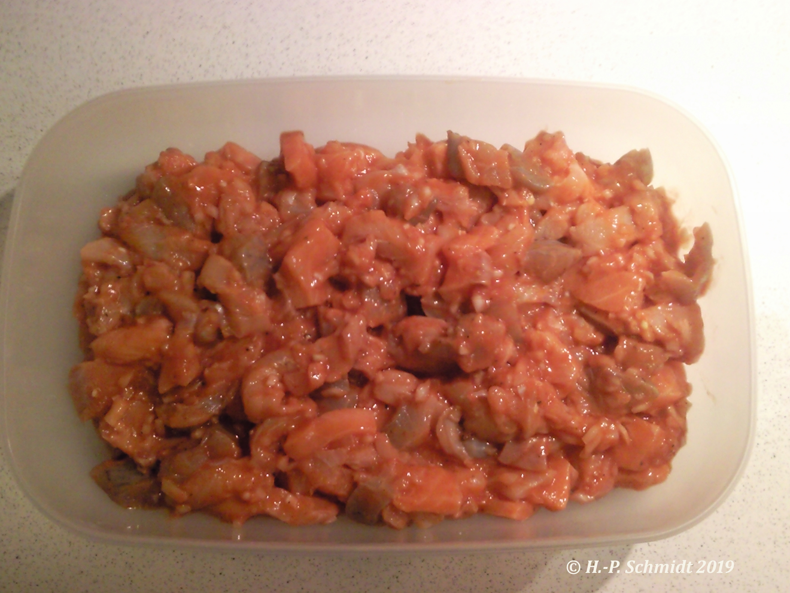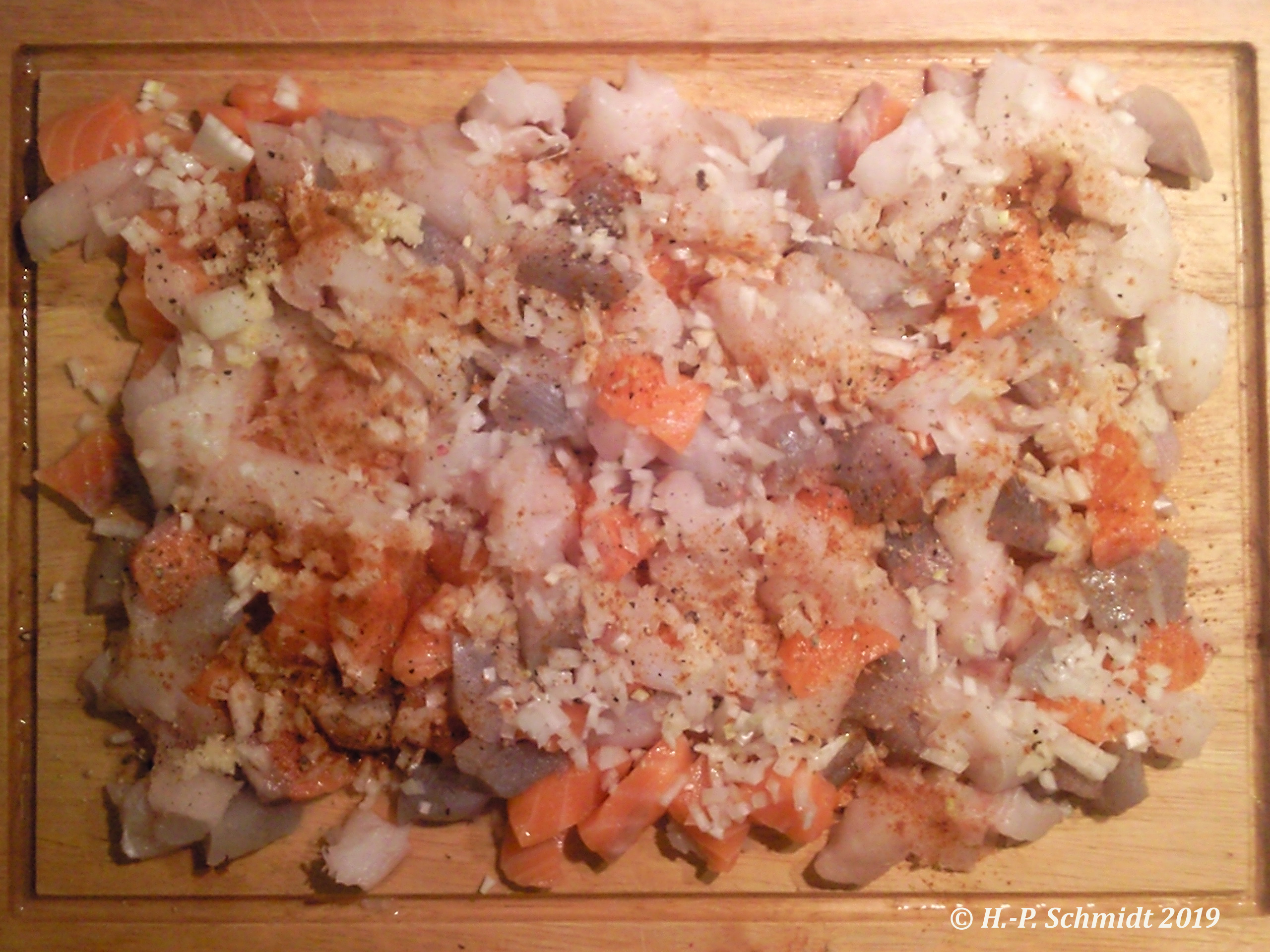 marinierten Fischteile (aus dem Kühlschrank) hinzugegeben (Ich gebe